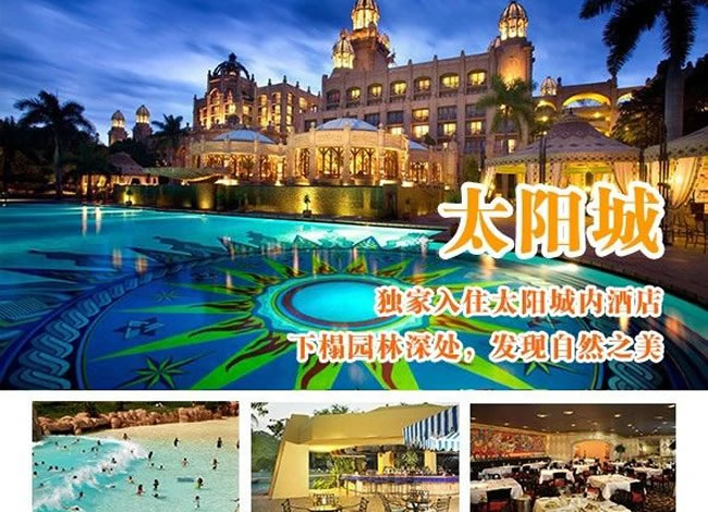 酒店早餐。前往機(jī)場(chǎng),搭乘航班飛往約堡。驅(qū)車前往南半球最大的娛樂中心-太陽城。不曾身臨其境,便無法真正理解太陽城給人所帶來的震撼。將古老傳說的神秘滄桑、非洲大陸的野性粗獷和現(xiàn)代生活的便利舒適那樣完美地融合在一起。你可以在失落城探尋非洲大陸上最古老的秘密,根據(jù)神話傳說興建的地震橋以及豪華賭場(chǎng)、著名的建筑-失落城等。這里有清幽的湖光山色,無數(shù)的珍禽異草,游人可漫步其中享受。(含自由活動(dòng)游覽時(shí)間約3小時(shí)) 晚餐后,入住太陽城內(nèi)豪華酒店,您可于太陽城內(nèi)賭場(chǎng)大顯身手。溫馨提示:約堡-太陽城,約210公里,車程約3小時(shí)