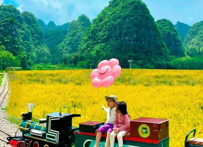 乘坐空調(diào)旅游觀光列車出發(fā),列車上來自興義的阿哥阿妹帶領(lǐng)大家感受濃濃 的布依族風情,一起載歌載舞,感受春日的美好浪漫。