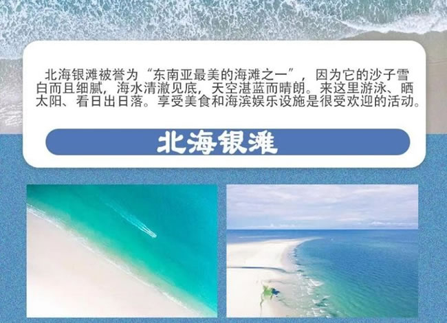 北海銀灘被譽為“東南亞最美的海灘之一 ”因為它的沙子雪白而且細膩,海水清 澈見底,天空湛藍而晴朗。來這里游泳、曬太陽、看日出日落。享受美食和海濱 娛樂設施是很受歡迎的活動
