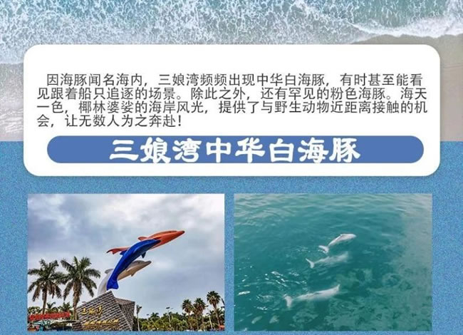 因海豚聞名海內(nèi),三娘灣頻頻出現(xiàn)中華白海豚,有時甚至能看見跟著船只追逐的 場景。除此之外,還有罕見的粉色海豚。海天椰林婆娑的海岸風光,提供了與野 生動物近距離接觸的機 ·備讓無數(shù)人為之奔赴!