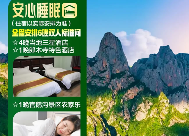 3、住宿:全程5晚商務(wù)型雙人標準間+1晚官鵝溝景區(qū)為農(nóng)家樂。(以實際安排為準)