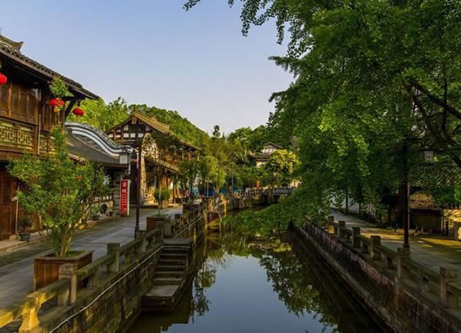 岷江的支流味江流經(jīng)地勢平緩的街子鎮(zhèn)口,形成一泓碧潭——龍?zhí)丁9沛?zhèn)水系發(fā)達,地下水豐富,石板路兩側(cè)及屋前院后,常年清水不斷,因而有“川西水鄉(xiāng)”之名?!扒喑呛蠡▓@”之稱。景區(qū)屬亞熱帶濕潤氣候,年平均氣溫15.9℃,盛夏氣溫低于成都市區(qū)4—5℃,全年均適宜旅游。