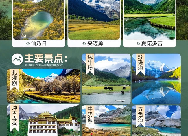 早上:7:00 早餐后乘車經(jīng)波瓦山到達(dá)【亞丁景區(qū)】(門票已含,首次觀光車 120/人自理,必須消費(fèi)),后在游客接待中心換乘景區(qū)觀光車抵達(dá)亞丁景區(qū)【扎灌崩】(40 公里,車程 1.5 小時(shí)),下車后游 客徒步上山直接抵達(dá)沖古寺。 中午:景區(qū)中餐自理,觀賞沖古寺風(fēng)光及神山仙乃日風(fēng)光,然后可自費(fèi)乘坐電瓶車(自理往返 70/人,單程 40/人)前往【洛絨牛場(chǎng)】(如徒步需 1-2 小時(shí)左右達(dá)到洛絨牛場(chǎng))。這里是觀【夏諾多吉神山】(意為金剛手菩薩,海拔 5958 米)【央邁勇神山】(意為金文殊菩薩,海拔 5958 米)的最佳地點(diǎn),讓神山圣水與心共鳴,盡情沉醉在夢(mèng)幻之地,后原路返回,到達(dá)【扎罐崩】乘觀光車返回住宿地。 晚上:回到日瓦鎮(zhèn)或稻城,晚餐后入住酒店。溫馨提示:因當(dāng)天游客出景區(qū)時(shí)間不統(tǒng)一,所以旅游車無(wú)法統(tǒng)一接送游客,游客可以選擇乘坐當(dāng)?shù)毓卉嚕?-10元/人自理)。亞丁景區(qū)分長(zhǎng)線—牛奶海、五色海和短線—珍珠海游覽。長(zhǎng)線游覽:因牛奶海和五色海海拔高,客人務(wù)必根據(jù)自身實(shí)際情況選擇是否前往(可選擇自費(fèi)騎馬305元/人至舍身崖約1.5小時(shí),再徒步至牛奶海和五色海需約1.5小時(shí),冬季11中旬至次年3約中旬馬幫停運(yùn),需徒步單程5KM往返10KM,徒步往返時(shí)間約4.5小時(shí))到達(dá)【牛奶海】,再徒步前往【五色?!浚ㄍ讲郊s20分鐘);【牛奶海】海拔4800米,又叫洛絨措,古冰川湖,狀如水滴,四周雪山環(huán)繞,湖水清瑩碧藍(lán),山止成瀑,以其玲瓏秀雅水色翠藍(lán)而著名。牛奶海在央邁勇的山坳里,呈扇貝形,中間是碧藍(lán)的雪水,周邊則是一圈乳白色環(huán)繞,這圈乳白色大致就是牛奶海名稱的由來(lái)。牛奶海是美麗的,遠(yuǎn)遠(yuǎn)望去,仿佛碧玉鑲嵌在雪山之中,純凈安詳。純凈的湖水給人以平和安寧的心境,而藍(lán)湛湛的海子并不透明,顯得神秘莫測(cè)。傳說(shuō)能治聾啞病的圣湖?!疚迳!亢0?600米,由于光的折射下,產(chǎn)生五種不同顏色而得名:其真名為“登崇措”。五色海它位于仙乃日與央邁勇之間,湖面呈圓形。面積0.7公頃,現(xiàn)代冰谷下伸至湖畔,雪山倒影湖面,呈現(xiàn)奇幻的色彩。是藏區(qū)著名的圣湖(佛經(jīng)中贊譽(yù)該湖與西藏羊巴雍措齊名),據(jù)傳能“返演歷史,預(yù)測(cè)未來(lái)”。短線游覽:游客可乘坐景區(qū)觀光車抵達(dá)扎灌崩,徒步500米到達(dá)沖古寺,前往仙乃日神山下的圣湖【珍珠海】短線游覽(單程約1.5KM,徒步前往約40分鐘),海拔3950米?!菊渲楹!吭诓卣Z(yǔ)中稱為“卓瑪拉措”,是仙乃日的融雪形成的海子。面積約0.1平方公里。密林中的珍珠海如一顆鑲嵌在蓮花寶座上的綠寶石,碧波蕩漾,粼粼波光中透出無(wú)限清麗,湖畔四周,參翠如屏。春天湖邊片片杜鵑花燦爛怒放,秋天層林盡染,倒影著五彩斑斕的世界,令人目眩神迷?!緛喍【皡^(qū)】以仙乃日、央邁勇、夏諾多吉三座雪峰為核心區(qū),北南向分布,三座雪山呈品字形,三峰藏名為“念青貢嘎日松貢布”,意為“三怙主雪山”,是眾生朝圣積德之所在地。由于特殊的地理環(huán)境和自然氣候,形成了獨(dú)特的地貌和自然景觀,是中國(guó)保存最完整的一處自然生態(tài)系統(tǒng)。