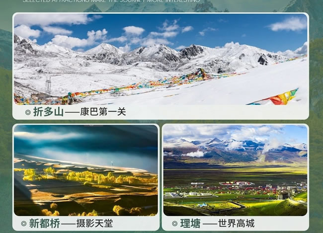 早上:集合地點(diǎn)統(tǒng)一出發(fā),出發(fā)時(shí)間以師傅/導(dǎo)游通知為準(zhǔn),從成綿高速、成雅高速經(jīng)雨城【雅安】(以雅女、雅魚、雅雨三絕而聞名是川藏、青藏的咽喉,也是古南方絲綢之路和茶馬古道的門戶必經(jīng)之路)。下高速后沿秀美青衣江而上,觀青衣江河谷風(fēng)光。中午:經(jīng)雅康高速一路向西,經(jīng)過(guò)【二郞山】隧道,欣賞“一山有陰陽(yáng)”的兩種截然不同的奇觀,遠(yuǎn)眺大渡河風(fēng)光(川西最大最深峽谷),后經(jīng)情歌故鄉(xiāng)【康定】午餐,海拔 2560 米。然后乘車前往有小九寨之稱的4A級(jí)風(fēng)景區(qū)-【康定情歌風(fēng)景區(qū)】(又名木格措風(fēng)景區(qū),門票贈(zèng)送,觀光車90元/人自理,必須消費(fèi)), 它坐落于貢嘎山脈中段,附近有其他多個(gè)高山湖泊和溫泉,原始森林,草原和雪山景觀互相交融。景區(qū)由木格措圣湖、杜鵑峽、藥池沸泉、七色海、芳草坪等景點(diǎn)組成。木格措湖景色一日多變,清晨坦面無(wú)垠的湖面靜如鏡面,倒映著雪峰和群山;午后波濤滾滾,濤聲如雷震撼山谷;傍晚夕陽(yáng)西斜時(shí)湖面金光燦爛奪目。動(dòng)靜交替的湖水,日變?nèi)f千。在此還可觀賞到“猛虎臥山”、“觀音鎮(zhèn)?!钡绕婷钌骄?。在不同季節(jié)還可欣賞“雙霧墜海”、“木格夕照”、“木格漲潮”和迭瀑飛泉等云、霧、霞、水奇觀;在珍珠灘可享受沙浴、日光浴之樂(lè)。海濱可享沙浴、日光浴之樂(lè),湖中可乘坐游船(游船66元/人、游客可以根據(jù)自身情況自費(fèi)乘坐游覽)。七色海是一處湖水與溫泉交融的高原湖泊,杜鵑峽是木格措景區(qū)的走廊,藥池沸泉泉眼數(shù)十個(gè),景區(qū)以高山湖泊及溫泉為主要特色,融原始森林、草原、雪山為一體,互相映襯,一派原始古樸而幽靜的自然景色。木格措圣湖是川西北最大的高山湖泊之一,整個(gè)風(fēng)景區(qū)以圣湖、溫泉、雪山、草原、彩林、瀑布為主要特色,一派原始古樸而幽靜的自然景色,使人們仿佛置身于“瑤池仙境”。后翻越有“康巴第一關(guān)”的塞外屏障【折多山】,最高峰海拔 4900 米,埡口海拔 4298 米,也是川藏線上第一個(gè)需要翻越的高山埡口。至令人神往的“光與影的世界”“攝影家的天堂”【新都橋】。晚上:晚餐后入住新都橋/雅江酒店。游客若有需要可自行前往網(wǎng)紅打卡景點(diǎn)-【魚子西】(參考價(jià)格:小車擺渡費(fèi)60-80/人+清潔費(fèi)30/人請(qǐng)自理)屬于木雅貢嘎地區(qū),擁有以藏傳佛教為基礎(chǔ)的基本文化特征,項(xiàng)目范圍內(nèi)可 360 度遙望藏區(qū)四大神山之一藏區(qū)“第二香巴拉”的雅 拉神山全貌和四川最高峰“蜀山之王”的木雅貢嘎大雪山山系全貌,為貢嘎西坡地區(qū)難得的觀景攝影點(diǎn)。后帶著愉悅的心情乘車返回有攝影天堂之稱的【新都橋】。